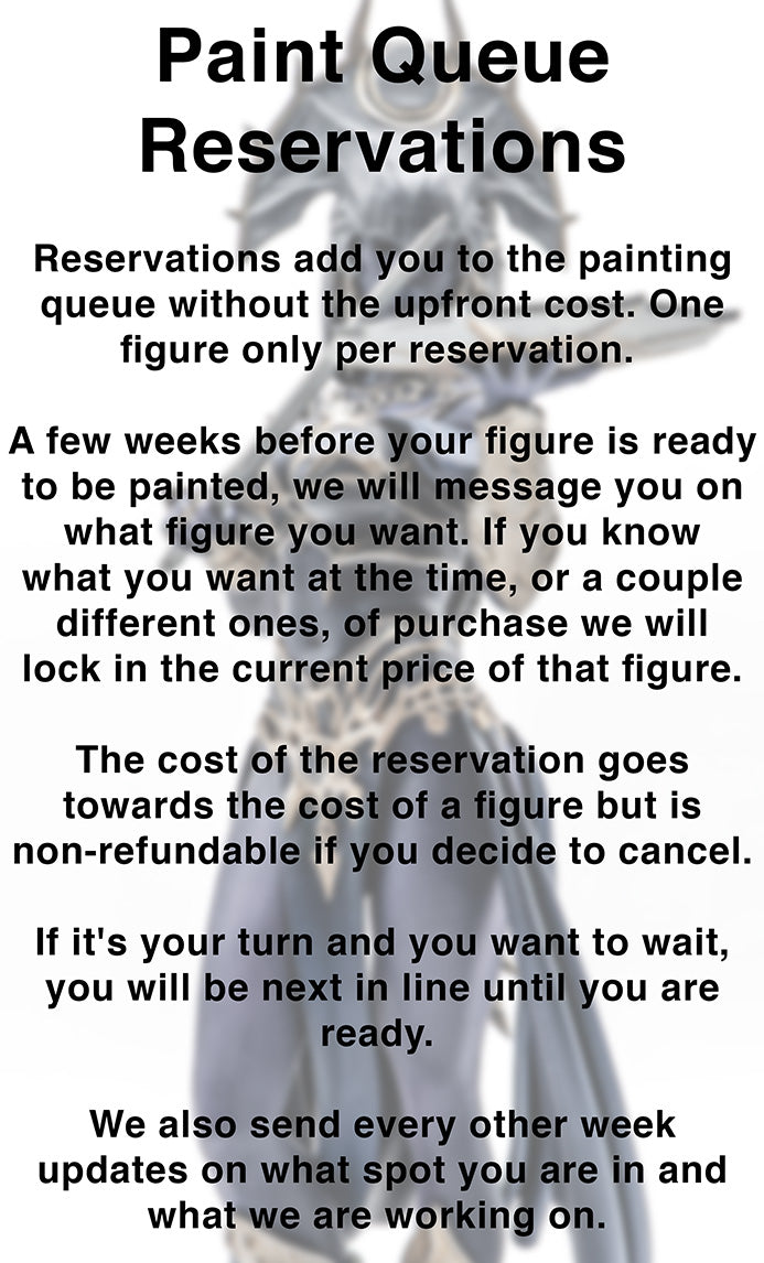 Models are assembled and primed in two colors of your choice, we will show examples of past figures. Then 1 aspect of the model being fully painted, like a weapon or the base, that can be discussed before or after purchase. This option is not put into the painting queue and is not listed in older listings yet. Send a message if you want this added to a listing.